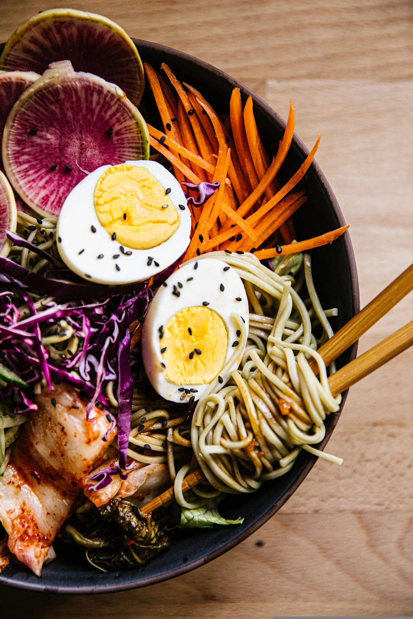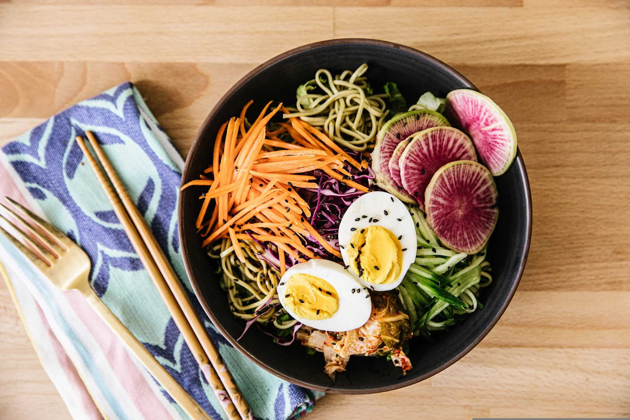 I start by layering my bowl some green lettuce then the soba noodles, vegetables, and finally a hard boiled egg for protein. You can skip the egg altogether or you could sub for tofu or your favorite meat. It’s totally customizable and the sauce really goes with so many things. Enjoy!